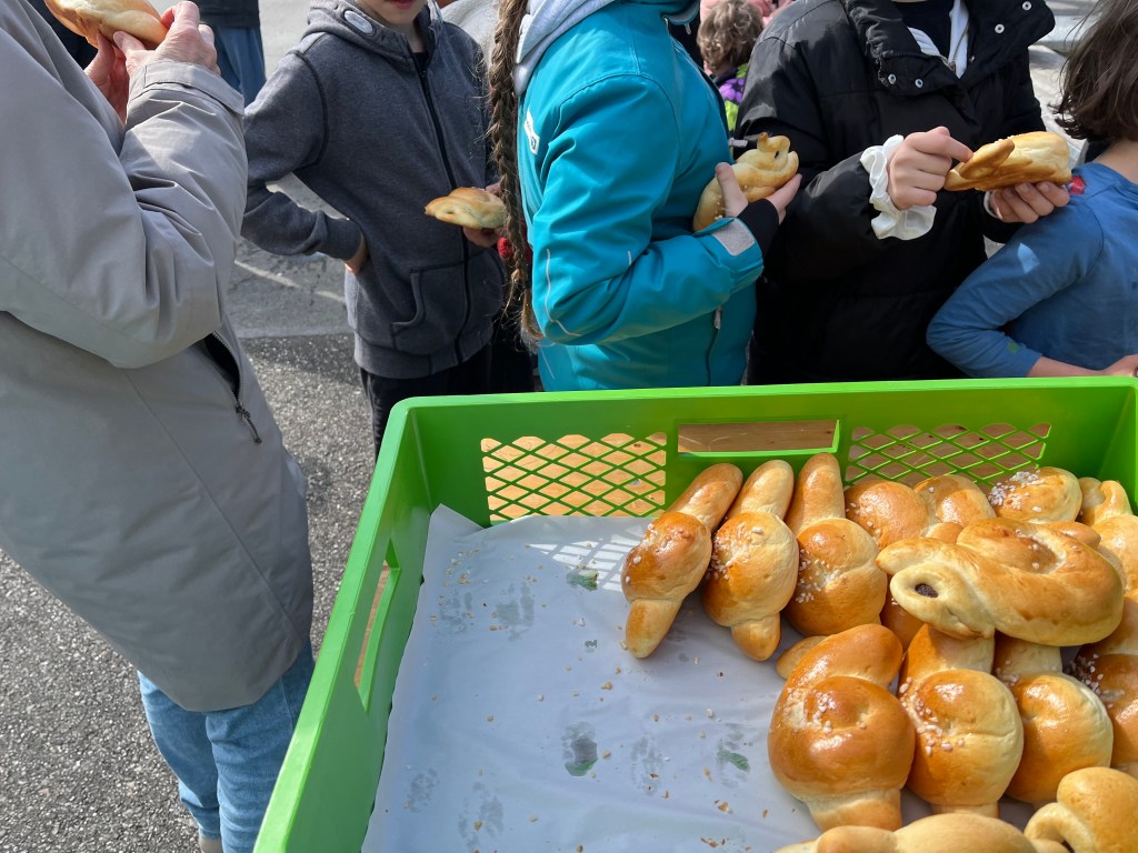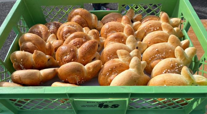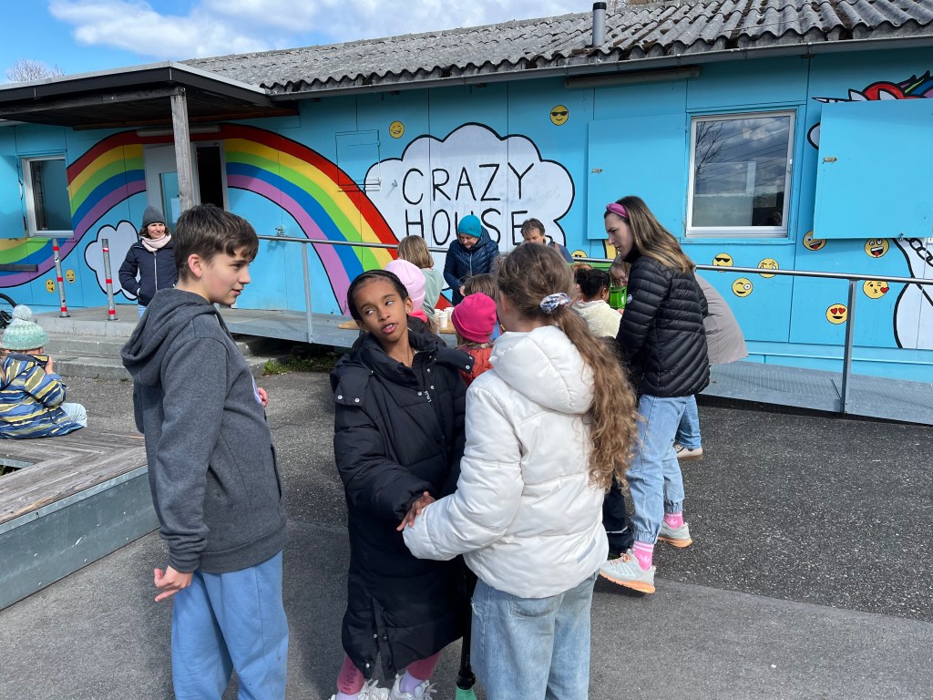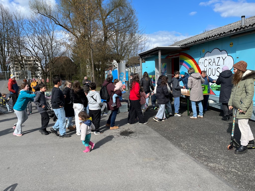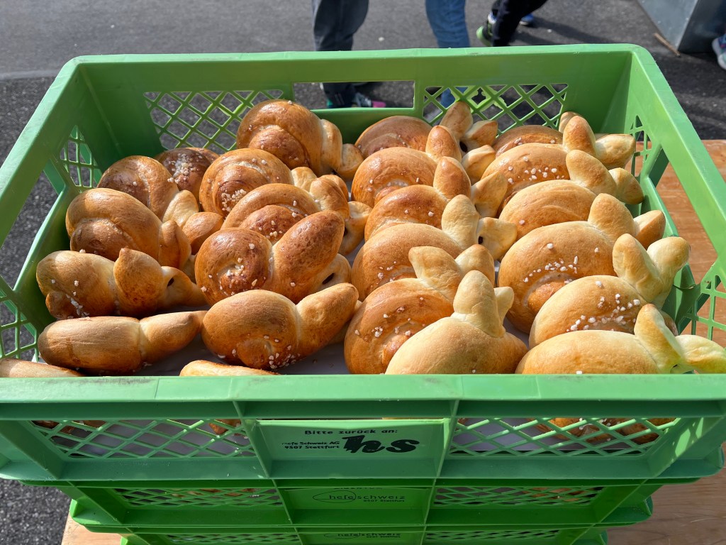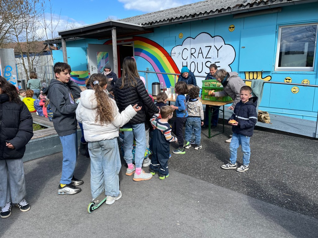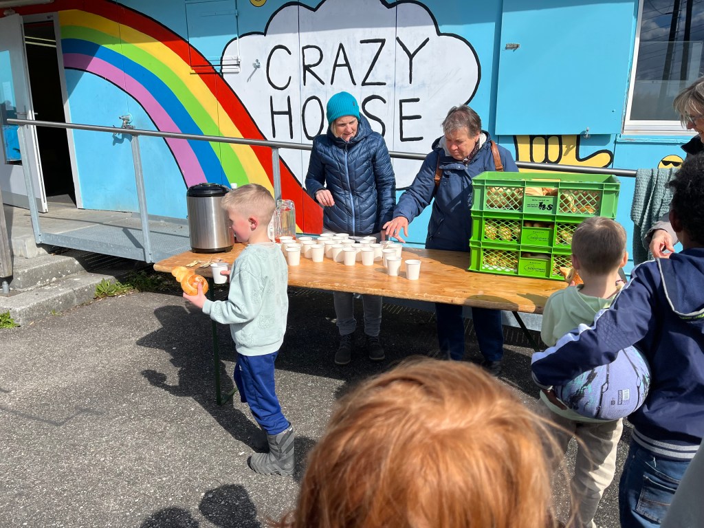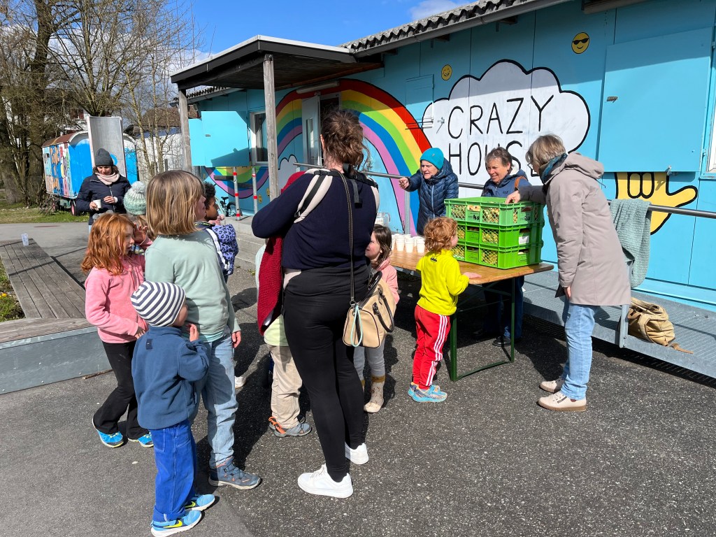 Alles in allem durften wir ca. 65 Kinder willkommen heissen und mit den jüngeren von ihnen zuerst in der Bibliothek Holzhasen suchen und bemalen, während die älteren bereits im und um’s Crazy House Schokohasen suchten und alle gemeinsam im Anschluss ein feines Z’vieri im Crazy House genossen.