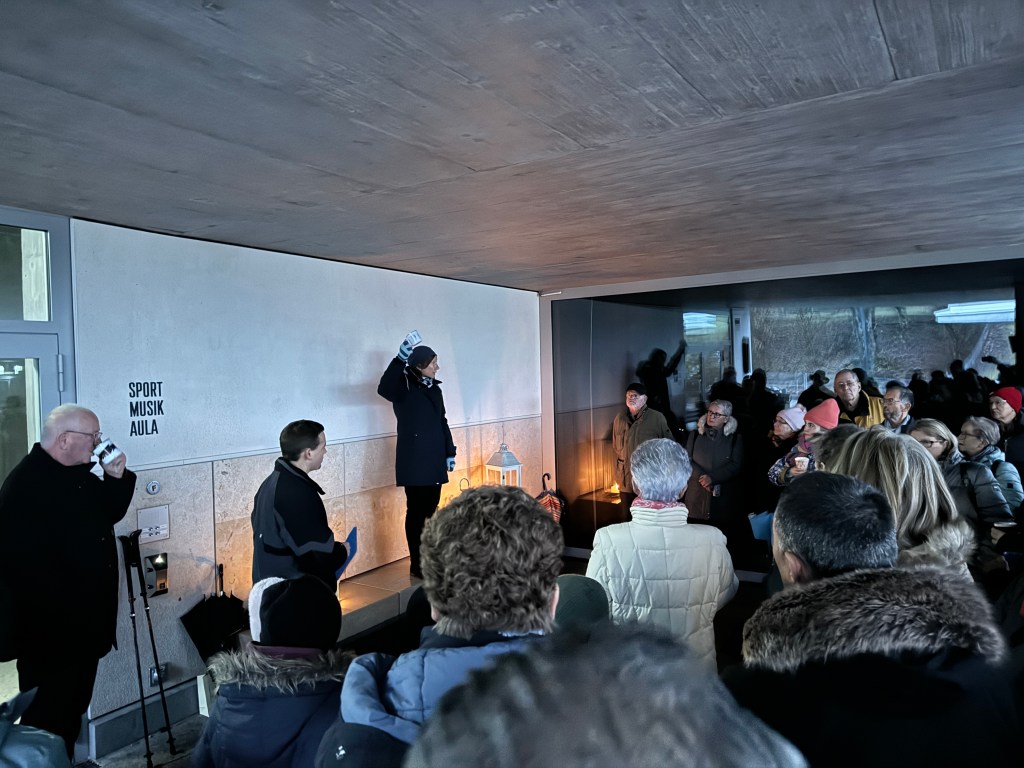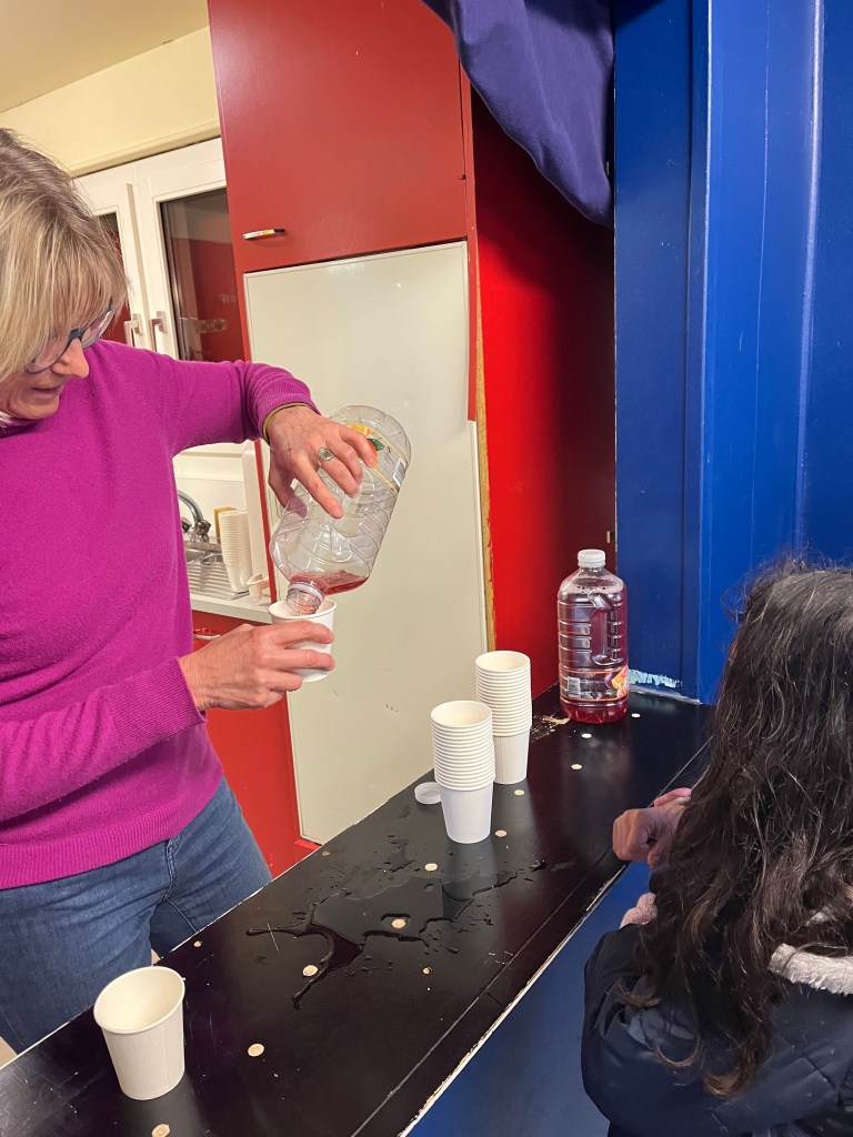 Begum hatte mit einer Freundin zuhause bereits das Dessert vorbereitet. Die 8 Helfer*innen begannen um 14 Uhr, stellten zuerst Tische und Stühle auf, dekorierten in den Landesfarben von Afghanistan, schwarz-rot-grün, deckten auf und halfen in der Küche beim Rüsten und Schnetzeln. Ein fideles Grüppchen! Die Köchin Begum und ihr Mann Ahmad kochten und hatten alles im Griff.